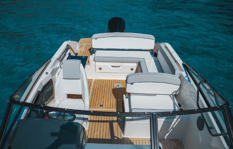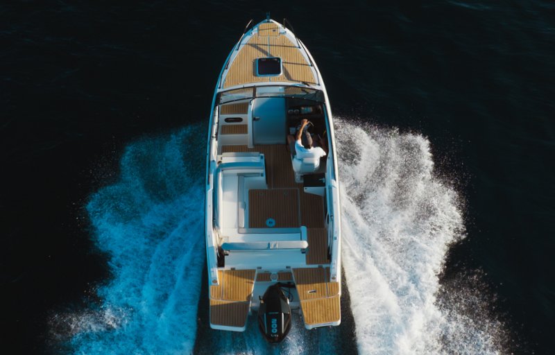 - Smart Edition (Kühlschublade, Cockpit-Dusche, Echtteak-Cockpittisch, Cockpit-Sonnenlounge, LED Innenbeleuchtung, Wasserskimast, Elektronik-Paket: GPS Simrad CRUISE 9" mit Sonar, Fusion Stereo mit 2 Lautsprechern)