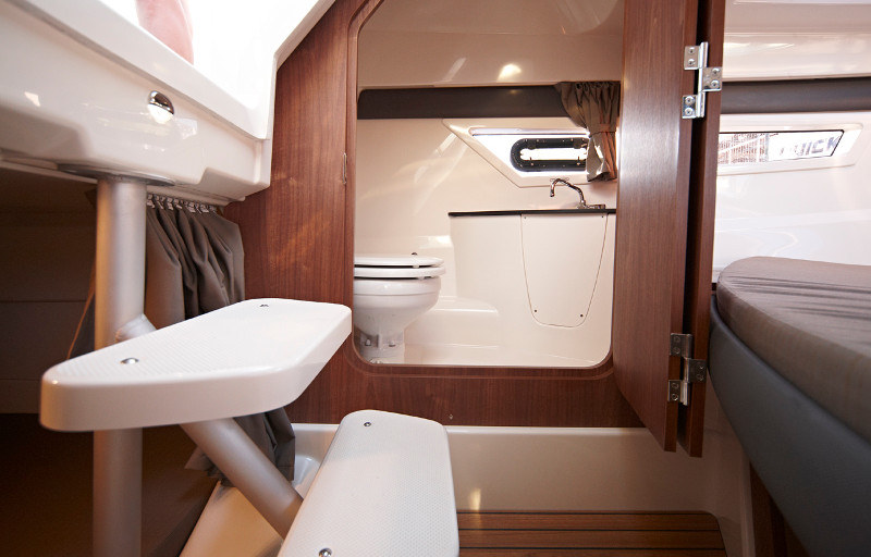 Als Übernachtungsmöglichkeit für bis zu 4 Erwachsene bietet dieses Quicksilver Boot eine geräumige und luftige vordere Kabine für 2 Personen und eine Doppel-Liege mittschiffs für 2 weitere Personen. Der separate Toilettenraum kann mit einem optionalen Marine-WC ausgestattet werden.